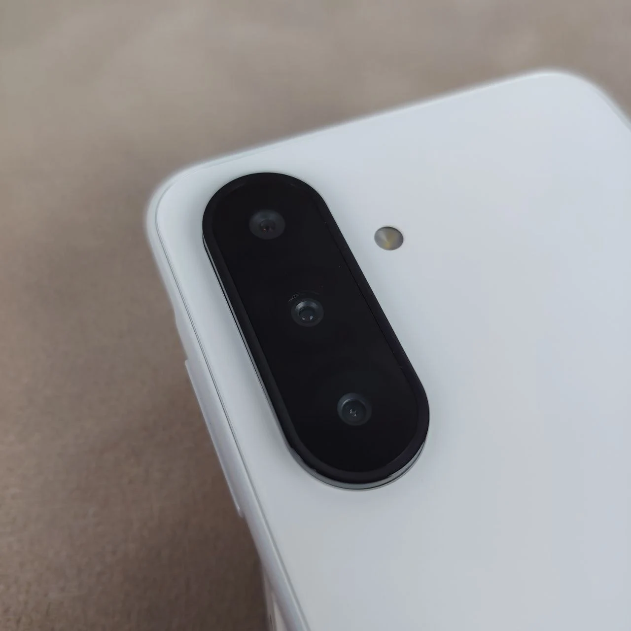 На правой стороне корпуса расположены кнопки включения и регулировки громкости. На задней панели находятся три объектива и вспышка.